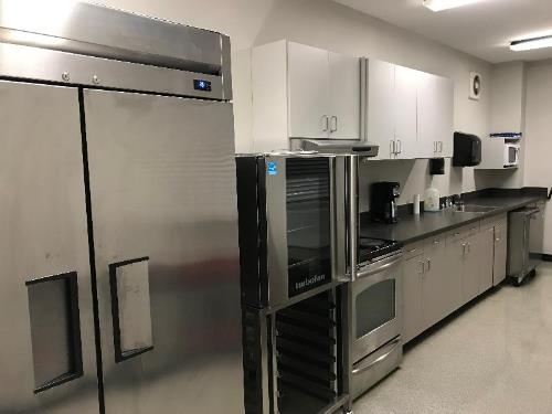 - Warming kitchen including a fridge, small freezer, microwave, oven, convection oven, and sink